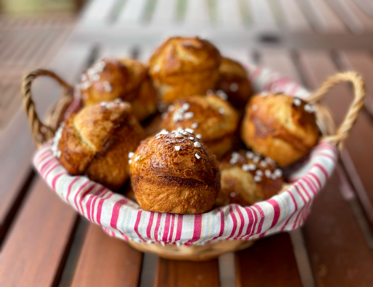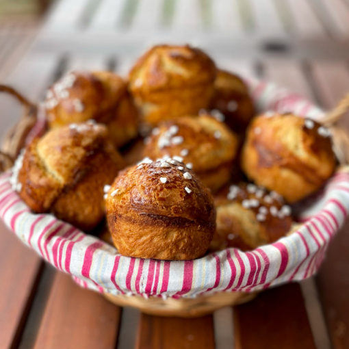 - Nach 20 Min. wird die Temperatur auf 220°C reduziert. Dabei noch einmal schwaden. Jetzt darf auch etwas Wasser oben auf das Brot kommen. Nach weiteren 20 Min. erneute Reduktion auf 190°C und ein letztes Mal schwaden. Nach insgesamt 1 Std. Backzeit ist das Brot fertig und kann aus dem Ofen genommen werden. Wenn man auf den Boden klopft, sollte es hohl klingen. Auf einem Rost zugedeckt auskühlen lassen.